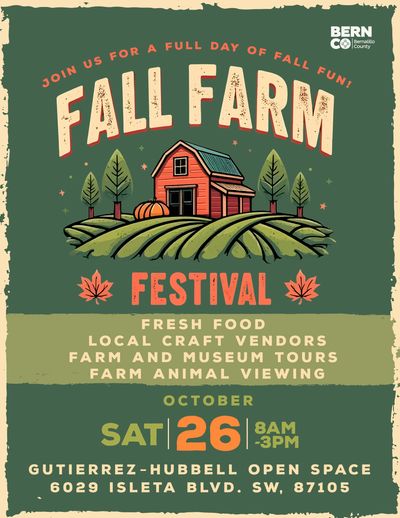 Please join us for our annual Bernalillo County Open Space Fall Farm Festival. There will be farm animal viewing, fresh foods, local craft vendors and farm and museum tours—Saturday, October 26, 8am-3pm.